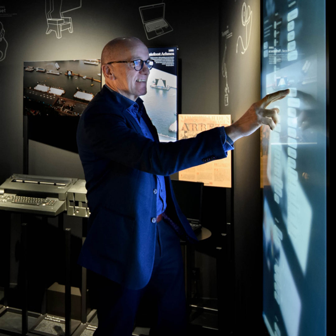 In samenwerking met SKVL heb ik de software ontwikkeld voor een levensgroot touchscreen waarmee de tentoonstelling digitaal kan worden bezocht, en voor de eyecatcher van de tentoonstelling: een metersgroot transparant scherm. In lijn met het logo is de interface gebaseerd op een schuin grid, waarmee ook de scrollrichting diagonaal werd.
