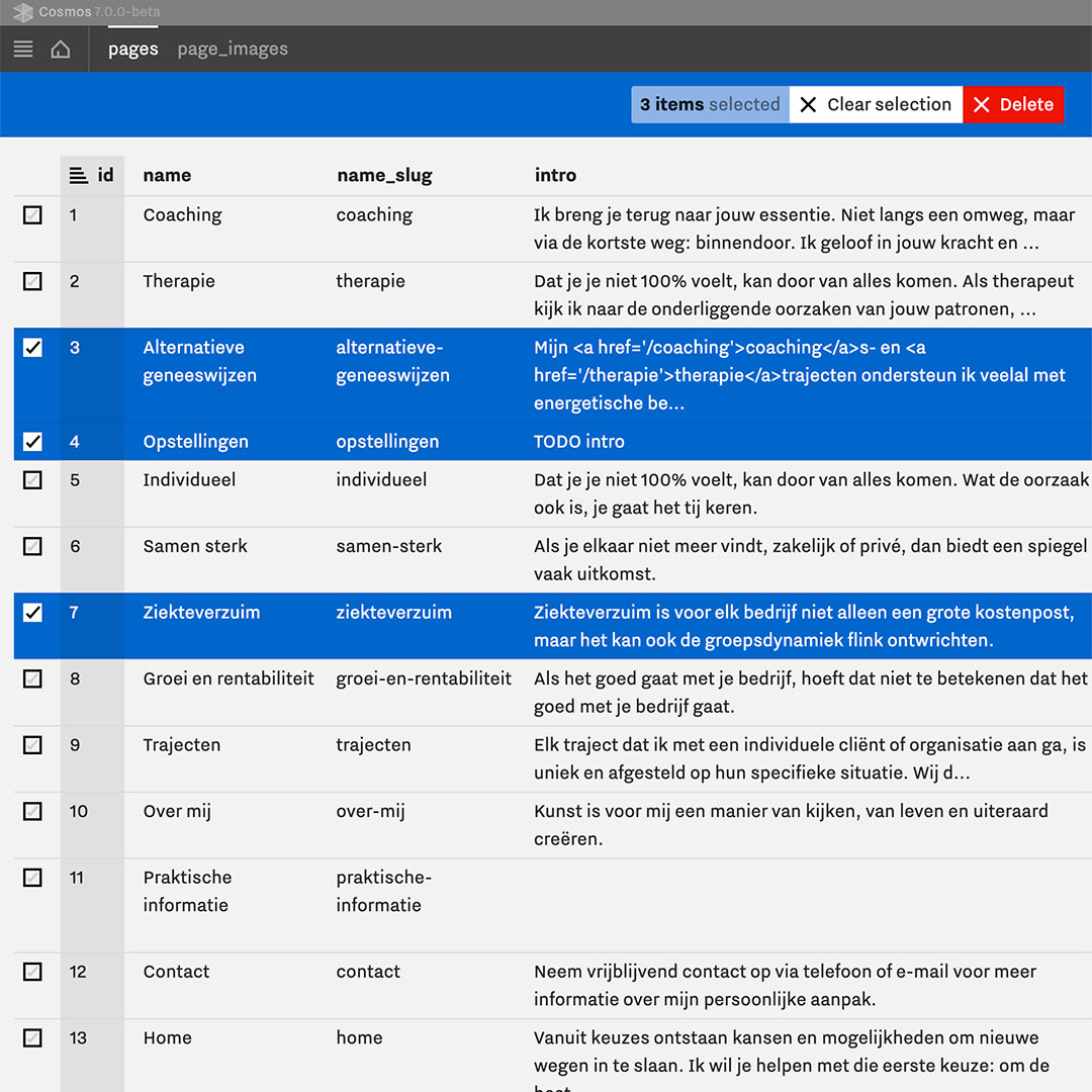 Parallel aan mijn opleiding heb ik de eerste versie van Cosmos ontwikkeld die al meteen tijdens mijn eerste stage als backend van een 'echte' website werd gebruikt. Sindsdien is het doorontwikkeld en herschreven tot een solide tool die nu als backend dient voor vrijwel al mijn projecten. Cosmos heeft alles in zich wat je van een headless CMS mag verwachten, en stelt bovendien lage eisen aan de server waar het op draait. Doordat ik gebruik maak van mijn eigen gereedschap kan ik flexibel met de wensen van klanten omgaan.
